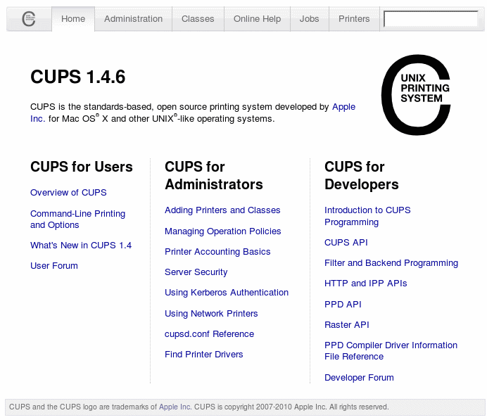 (In some recent CUPS versions, the logo graphic on the front page may be broken, but this appears to be a harmless cosmetic issue.)