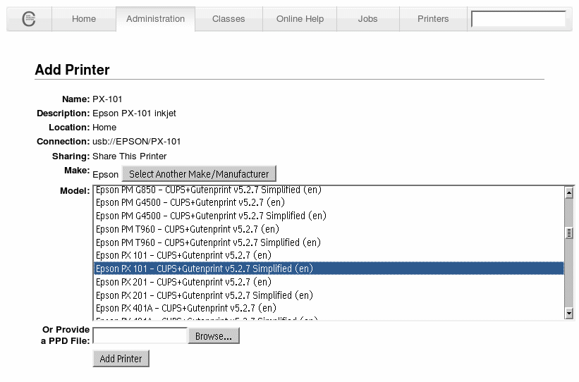• If your printer model isn't listed, but you have a PPD file for your printer, supporting one of the installed driver packages (Gutenprint, etc.), then you can specify that in the field at the bottom.