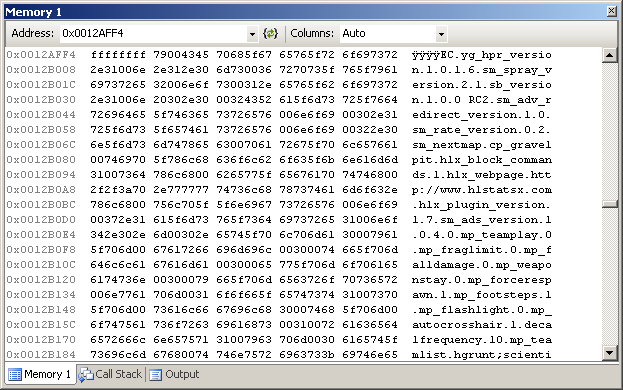 It looked like there was another engine function on the stack (0x0BBD4C40), but more interesting were its parameters. I inspected 0x0012AFF4 and got lucky: