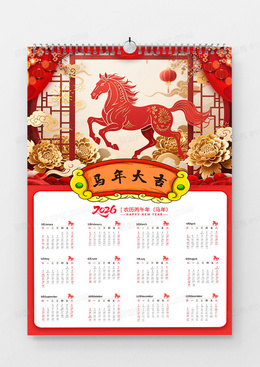 红色大气插画剪纸风2026马年挂历2026年马年日历海报