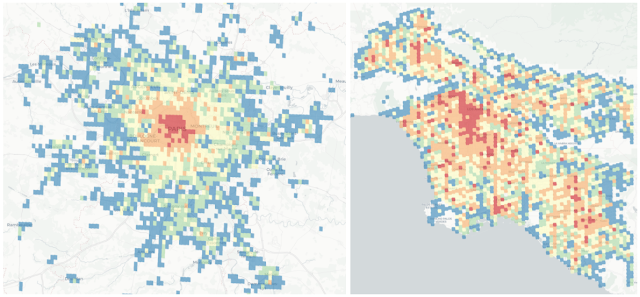 Below we see an example of two cities — Paris and Los Angeles. Though they have almost the same population size, those two populations move in very different ways. Paris is mono-centric, with an "onion" structure that has a distinct high-mobility city center (red), which progressively decreases as we move away from the center (in order: orange, yellow, green, blue). On the other hand, Los Angeles is truly poly-centric, with a large number of high-mobility areas scattered throughout the region.