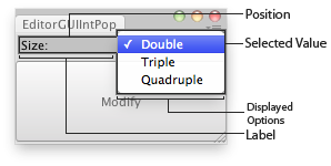 void OnGUI() { selectedSize = EditorGUI.IntPopup( new Rect(3, 3, position.width - 6, 20), "Size:", selectedSize, names, sizes);
