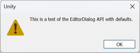 [MenuItem("Window/EditorDialog Example/DisplayAlertDialog with defaults")] public static void DisplayAlertDialogSimpleExample() { EditorDialog.DisplayAlertDialog(null, "This is a test of the EditorDialog API with defaults.", null); } } }