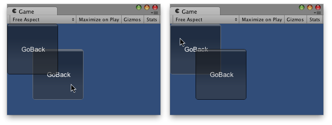 if (GUI.RepeatButton(new Rect(buttonX, buttonY, 200, 100), "Go Backwards", size)) { guiDepth = 1; example2.guiDepth = 0; } } }