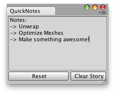 void OnGUI() { note = EditorGUILayout.TextArea(note, GUILayout.Width(position.width - 5), GUILayout.Height(position.height - 30)); EditorGUILayout.BeginHorizontal(); if (GUILayout.Button("Reset")) note = ""; if (GUILayout.Button("Clear Story", GUILayout.Width(72))) { note = "Notes:\n->\n->"; } EditorGUILayout.EndHorizontal(); }