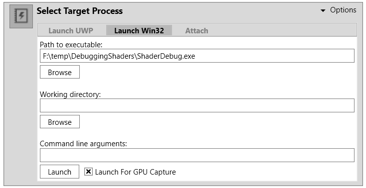 启用 Launch for GPU Capture__,然后使用__启动 (Launch) 按钮启动应用程序。
