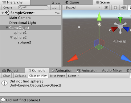 if (result) { Debug.Log("Found sphere3"); } else { Debug.Log("Did not find sphere3"); } } }