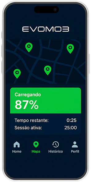 O app Evomob coloca você no comando. Acompanhe recargas em tempo real, visualize o consumo, agende horários, localize estações próximas e pague com facilidade — tudo na palma da mão. Pensado para motoristas, síndicos, parceiros e frotas, o app centraliza a gestão da mobilidade elétrica com tecnologia prática, segura, intuitiva e acessível de qualquer lugar.