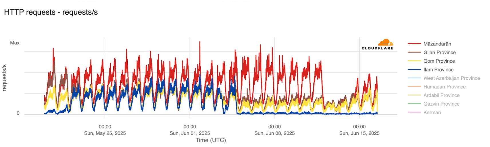 While a significant decrease in HTTP request rates had been observed since June 14, by June 16, Cloudflare data revealed a notable shift in HTTP traffic patterns across various Iranian provinces.
