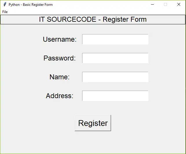 lbl_title = Label(TitleFrame, text="IT SOURCECODE - Register Form", font=('arial', 18), bd=1, width=640)