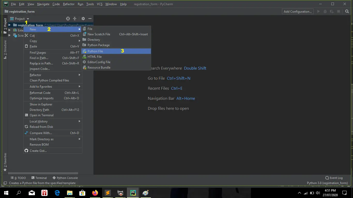 Second, after creating a project name, “right-click” your project name and then click “new.” After that click the “python file“.
