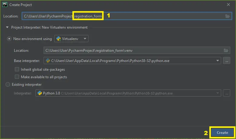 First, open Pycharm IDE and then create a “project name.” after creating a project name click the “create” button.