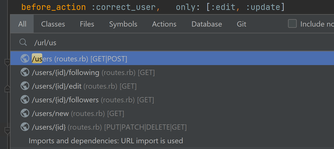 RubyMine prend d�sormais en charge la recherche d'URL Rails. Il vous suffit de taper /url dans la bo�te de dialogue Search Everywhere pour rechercher un fichier contenant l'URL souhait�e et y acc�der. Vous pouvez �galement utiliser un raccourci clavier : Ctrl+Shift+\.