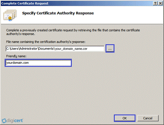 File name containing the certificate authority's response: | Click the … button to locate the .cer file you received from DigiCert (e.g., your_domain_com.cer). |