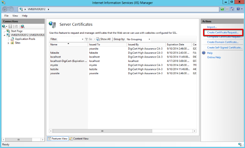 In the Actions menu, click Create Certificate Request to open the Request Certificate wizard.