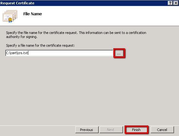 On the File Name page, click … to browse to a location where you want to save the CSR file, enter the filename, and click Open.