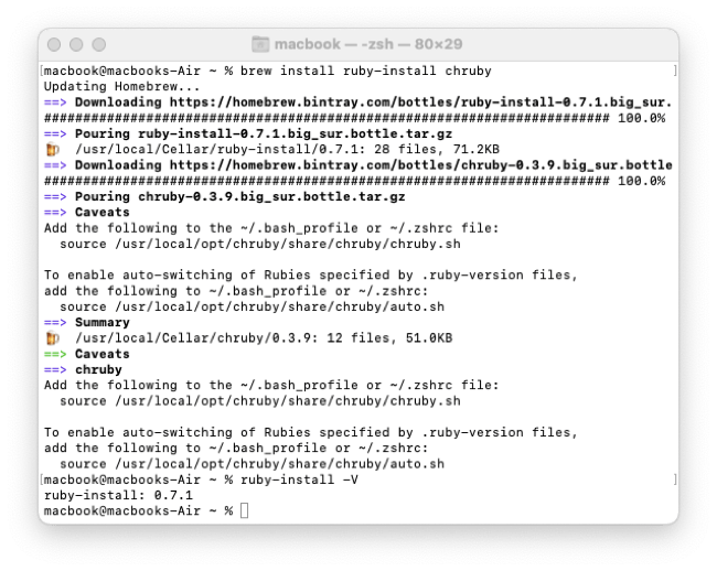 After closing and reopening the Terminal window, use chruby -h to check that Chruby was installed successfully.