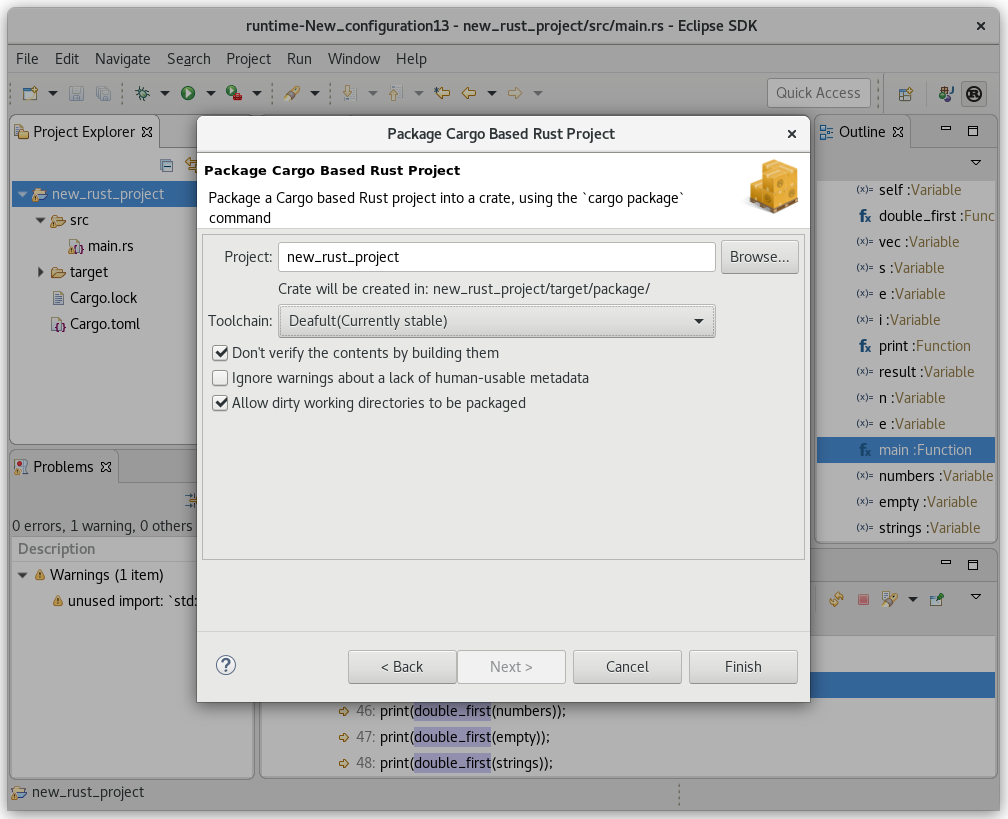 Corrosion also integrates various operations of the `cargo` command-line (New Project, Build, Run, Debug, Package) as typical Eclipse IDE wizards and workflows.