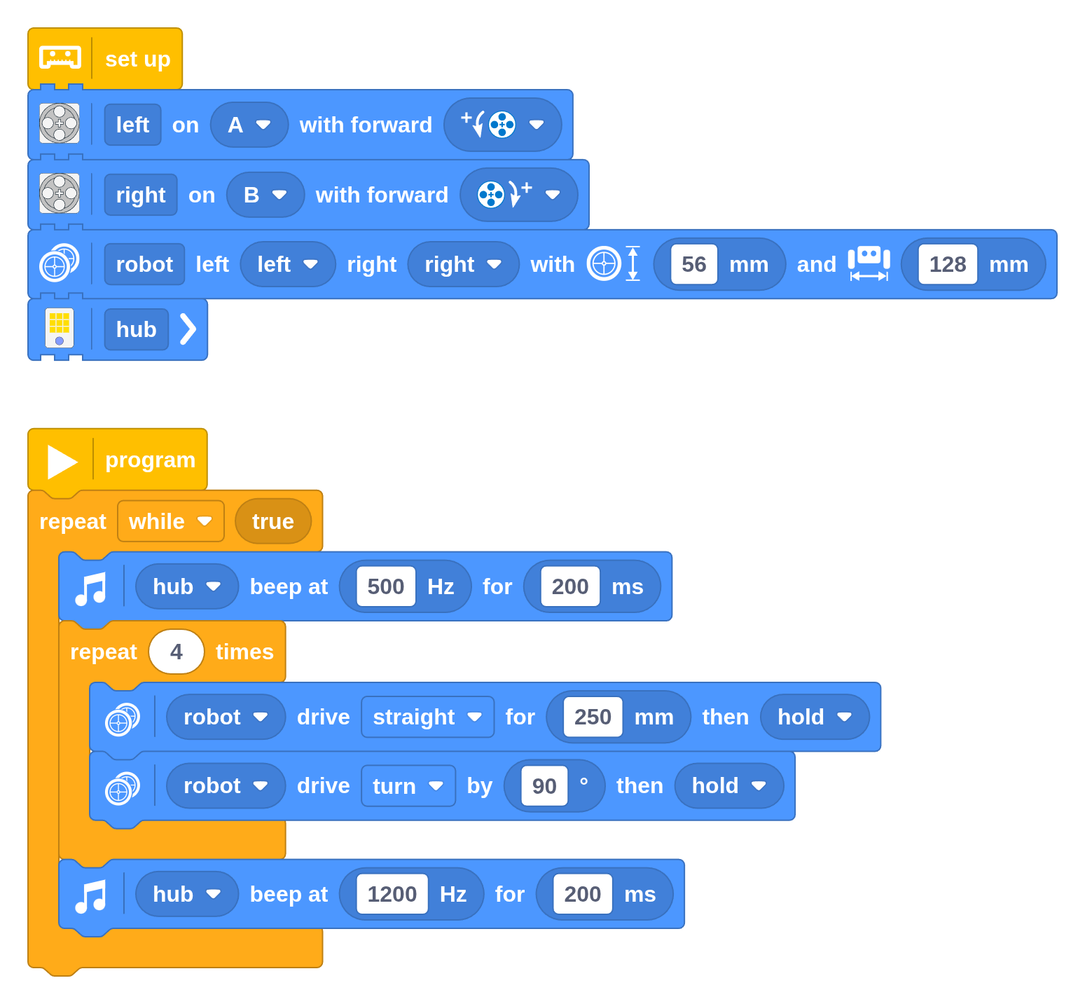 This program makes the robot play a low-pitch sound, drive in a square shape, and then play a higher-pitch sound. This whole sequence repeats forever.