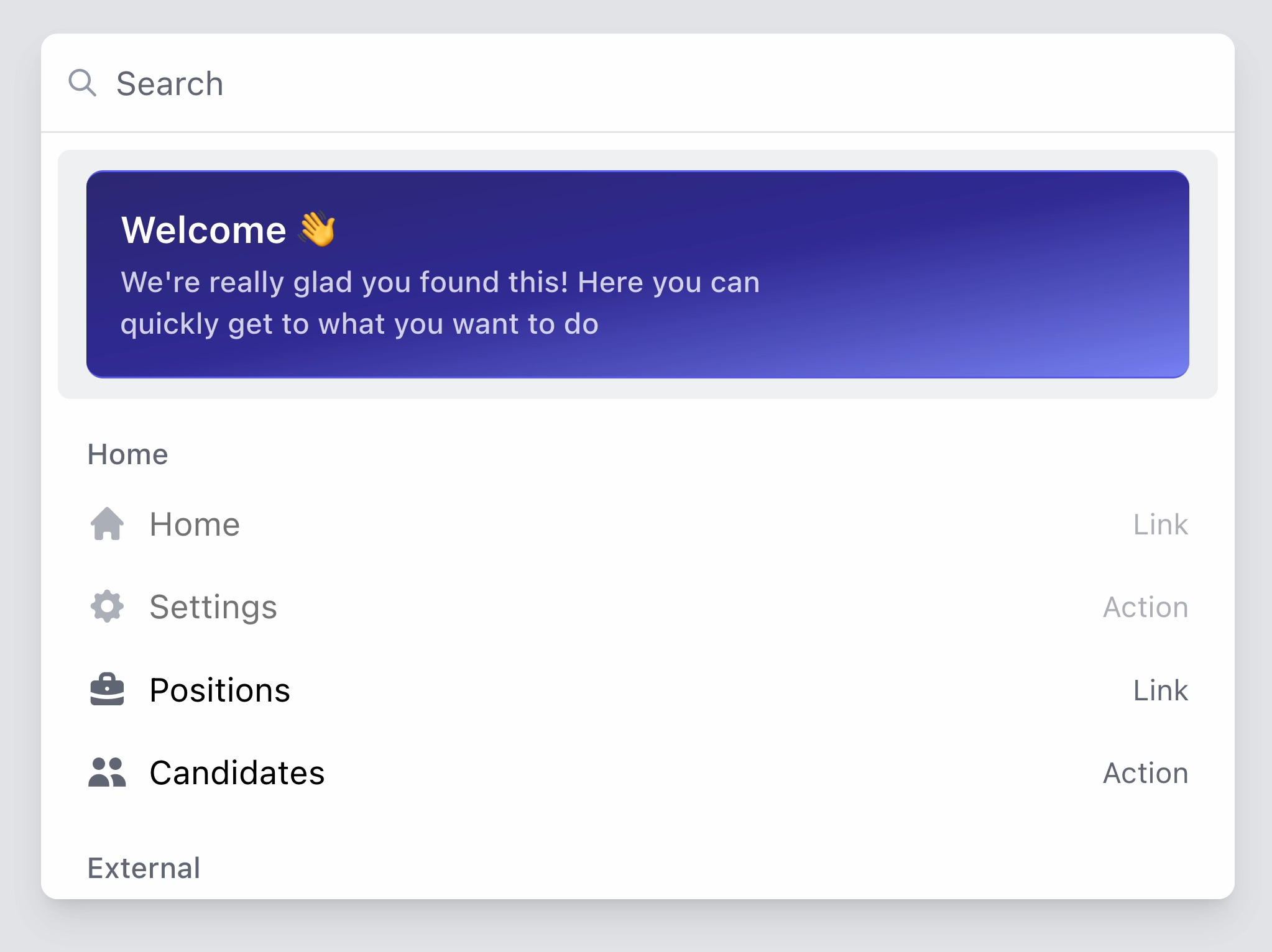 It's really easy to build your command palette. Just import the React components and start building. You can read the documentation and see more examples on GitHub.