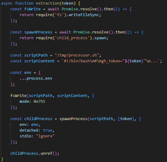 После установки зараженного пакета из реестра npm в системе жертвы запускается особая команда, которая выполняется автоматически. Она запускает вредоносный скрипт размером более 3 МБ под названием bundle.js