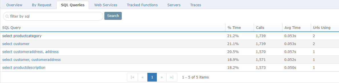 The SQL Queries tab shows all SQL queries that have been found inside the request traces and can be sorted by a variety of fields. You can click into these queries to view more detailed information about it's performance and the originating requests.
