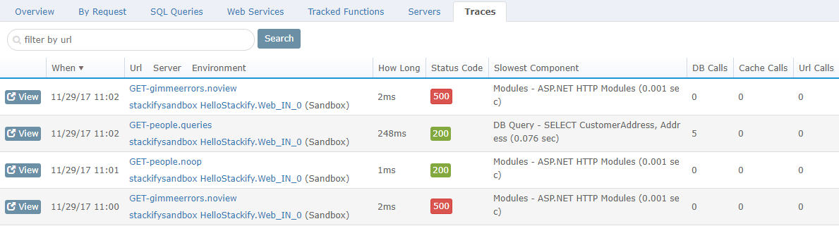 The Traces tab shows all gathered traces and is sortable by a variety of fields. You can either click the Request name to view details on the trace or click the server name to go to the Server Dashboard.