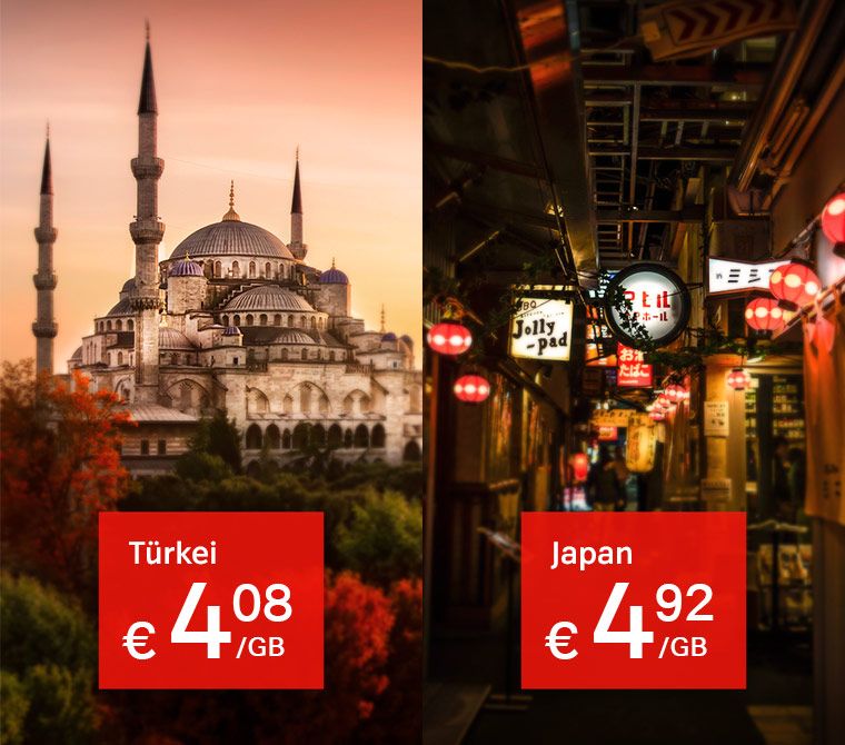 Außerhalb der EU erhalten Sie eine SMS mit den Konditionen & GB Preisen, z.B. Türkei € 4,08/GB. Ist das GB verbraucht, wird automatisch ein weiteres gebucht. Reisen Sie weiter, gelten die Preise des neuen Landes (z.B. Japan € 4,92/GB).
