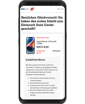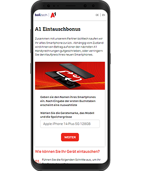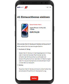 Zusammen mit unserem Partner bolttech kaufen wir Ihr altes Smartphone zurück. Abhängig vom Zustand bekommen Sie dafür durchschnittlich € 150,- auf einer der nächsten A1 Handyrechnungen gutgeschrieben. Und zusätzlich € 50,- A1 Bonus. Oder Sie verringern den Kaufpreis Ihres neuen Smartphones. Einfach über die A1 Eintauschbonus Webseite altes Handy bewerten. Danach im A1 Shop, in ausgewählten Post- oder Fachhandel-Filialen abgeben oder abholen lassen.