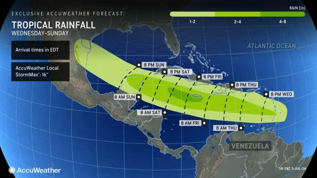 AccuWeather meteorologists are projecting that the system will cross the Windward Islands Wednesday night with the intensity of a tropical rainstorm or perhaps a tropical depression. Even if the system remains relatively weak compared to powerful Beryl, recent damage or destruction of infrastructure on some of the Windward Islands could make impacts worse.