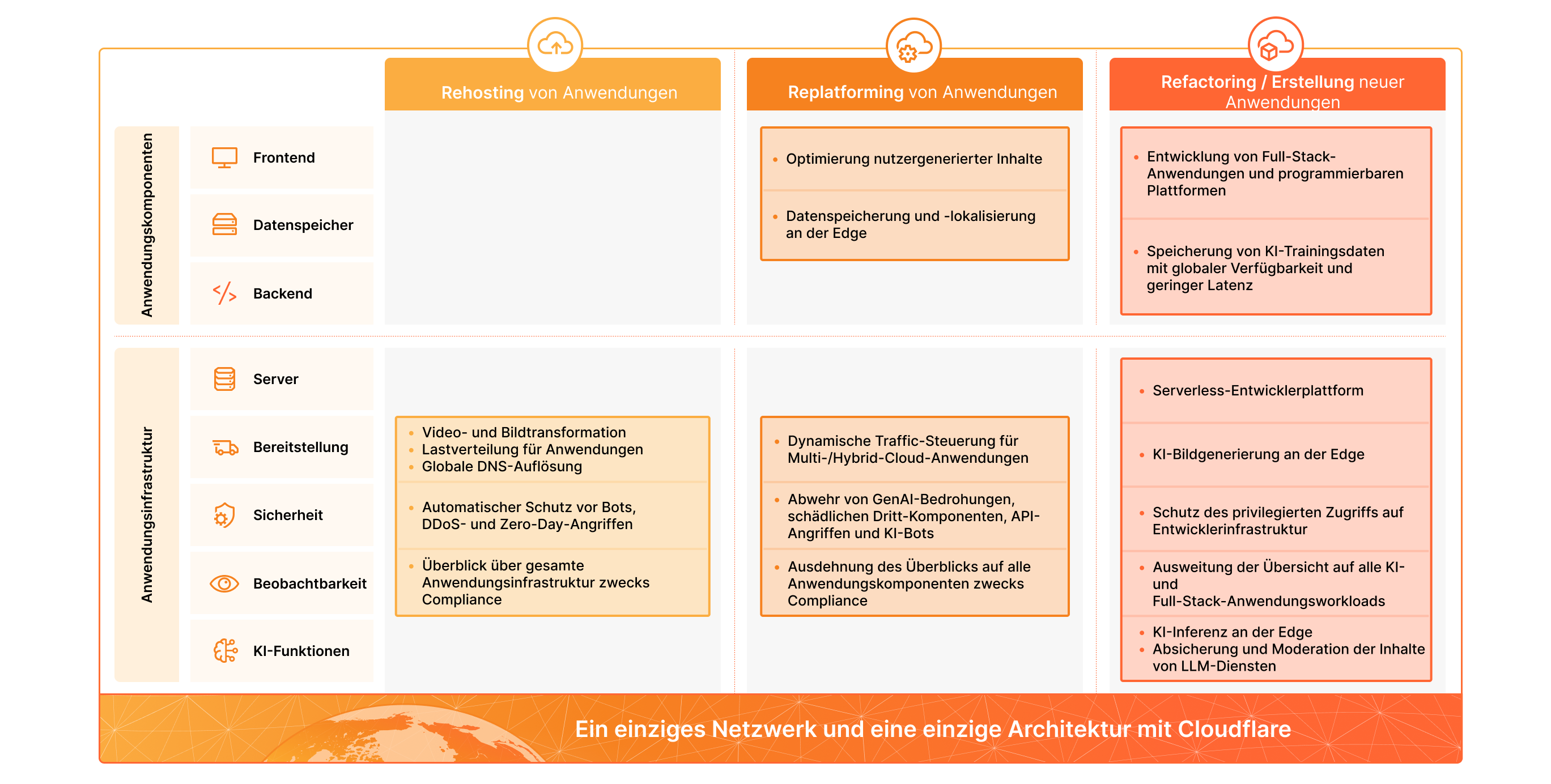 Mit Cloudflare trägt Ihre Strategie zur Anwendungsmodernisierung noch schneller Früchte – ob Sie sich nun für Rehosting, Replatforming, Refactoring oder die Entwicklung völlig neuer Anwendungen entscheiden.