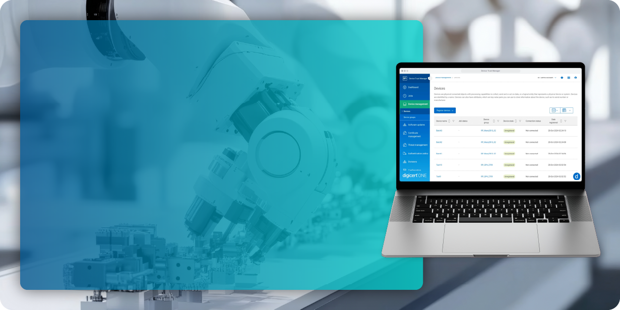 O DigiCert Device Trust Manager é uma solução líder do setor que entrega confiança abrangente para IoT, respondendo aos desafios da fabricação de dispositivos. Com o DigiCert Device Trust Manager, você pode adicionar facilmente segurança robusta e recursos de atualização ao seu dispositivo, reduzindo o tempo de lançamento no mercado e garantindo a conformidade regulatória.