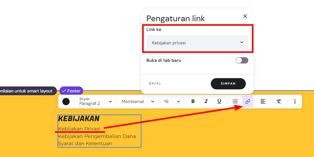 9. Tautkan teks dengan halaman legal yang sebelumnya dibuat.