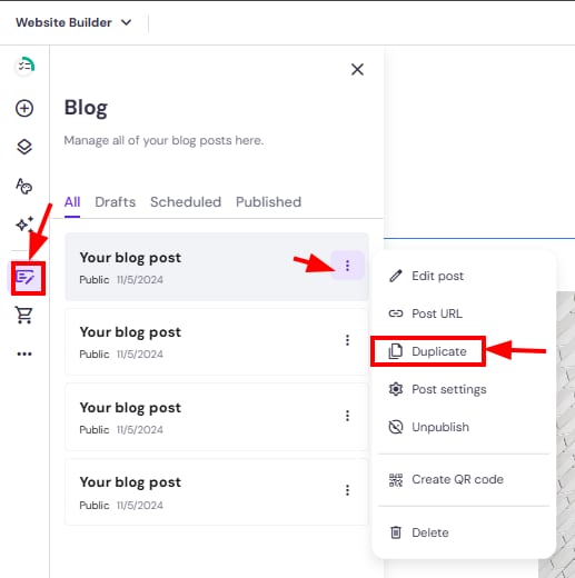 Within the editor, open the blog management panel on the left and find a post that you want to duplicate. Click on the ellipsis button ⋮ near the blog post title and click Duplicate:
