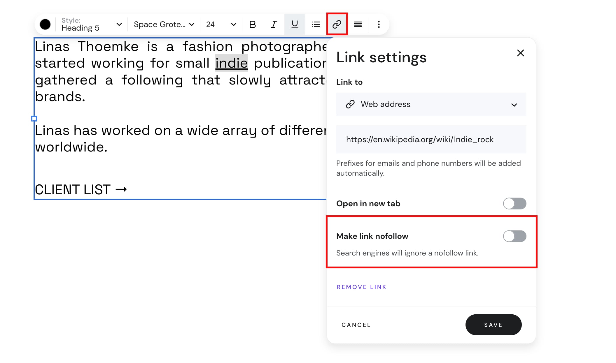 All links that you add to your website elements have the nofollow attribute by default, but you can easily change that in the link settings: