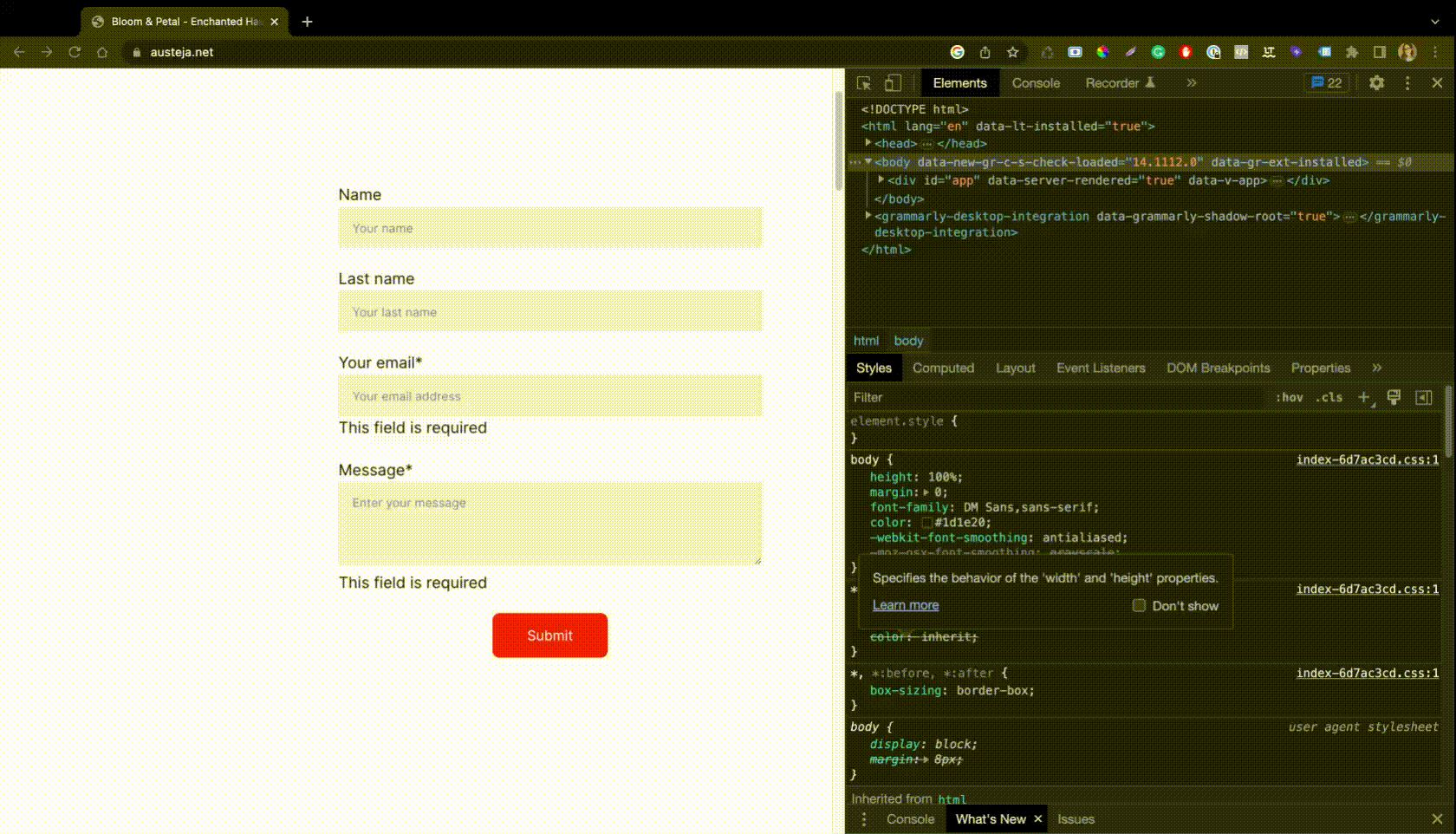 In this example, we’ll change the font color of the phrase This field is required that’s visible if somebody tries submitting a contact form without filling in the required fields: