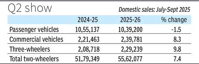 However, 2W sales grew by 7.4 per cent y-o-y to 55,62,077 units during Q2 this year as compared with 51,79,349 units in the corresponding period last year. Motorcycle sales grew by 5 per cent y-o-y to 33,70,495 units in July-September (against 32,09,965 units last year same period) and scooters sales grew by 12.4 per cent y-o-y to 20,59,957 (vs 18,32,306 units in July-September 2024), the SIAM report indicated.