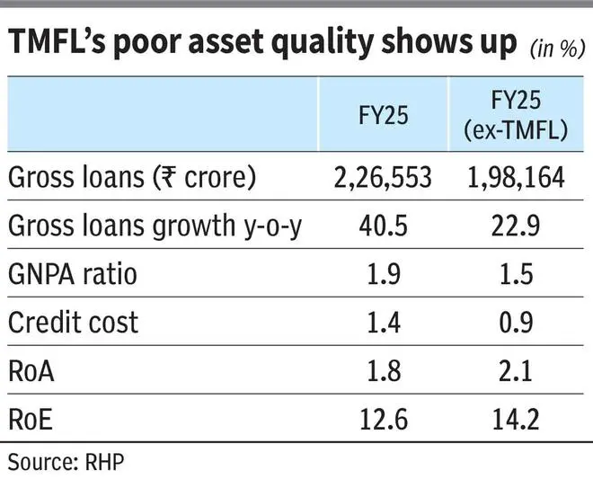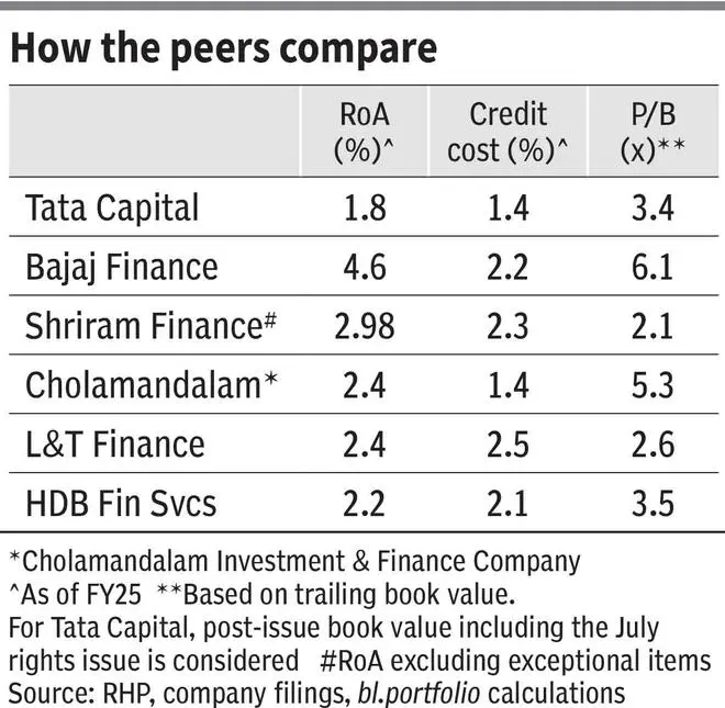 Fundamentals of TMFL (provided separately in RHP) do not inspire confidence. Gross loans have declined 7 per cent year on year in FY25 and profit of ₹52 crore in FY24 swung to a loss of 181 crore in FY25.. This, per the management, is largely because growth was put on the backburner to focus on the business integration with Tata Capital. More importantly, the asset quality of TMFL is worse than that of Tata Capital. GNPA ratio of TMFL (FY25) stood at 7.1 per cent versus Tata Capital’s (ex-TMFL) 1.5 per cent. Hence TMFL’s higher credit cost (provisions and write-offs) inflated Tata Capital’s credit cost too, in FY25 (see chart), though forming just 13 per cent of the loan book. Higher credit cost meant lower RoA for the merged entity. Even sequentially, credit cost has inched up 20 bps to 1.6 per cent, as of Q1 FY26.
